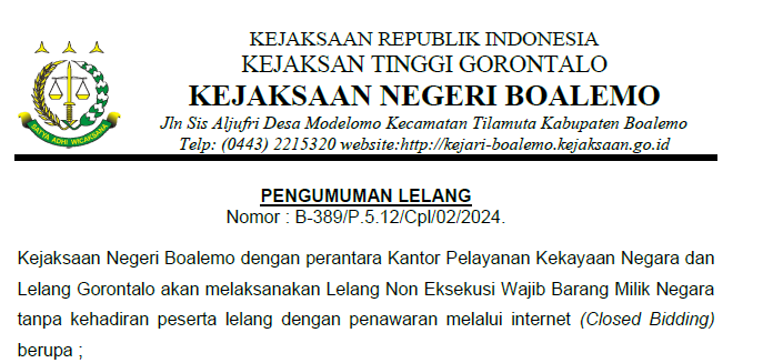 Pengumuman lelang Kejaksaan Negeri Boalemo